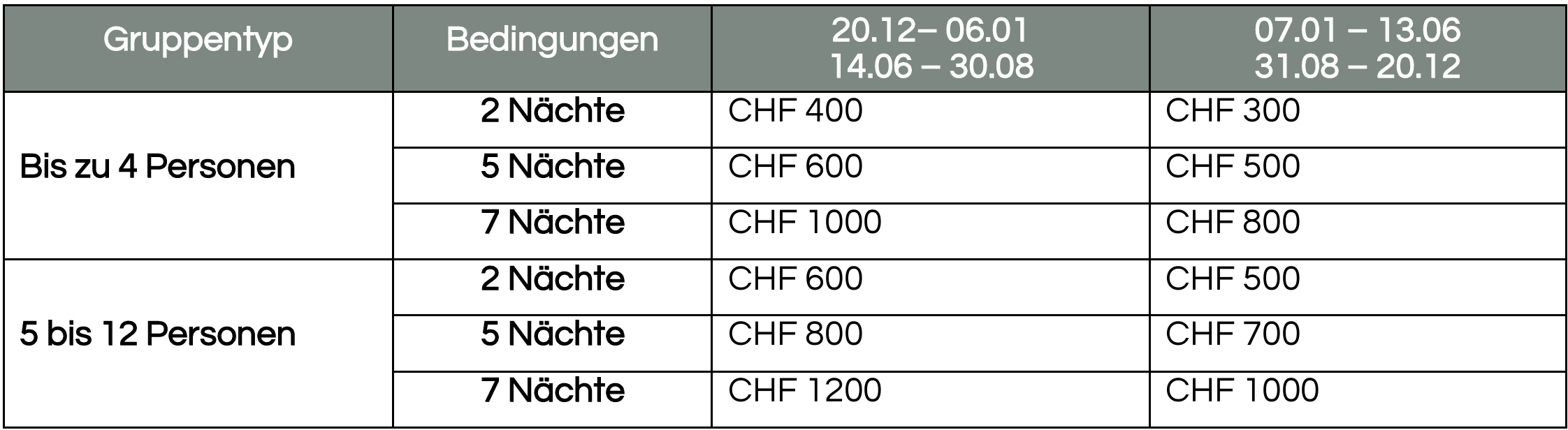 - 2 Nächte: CHF 400