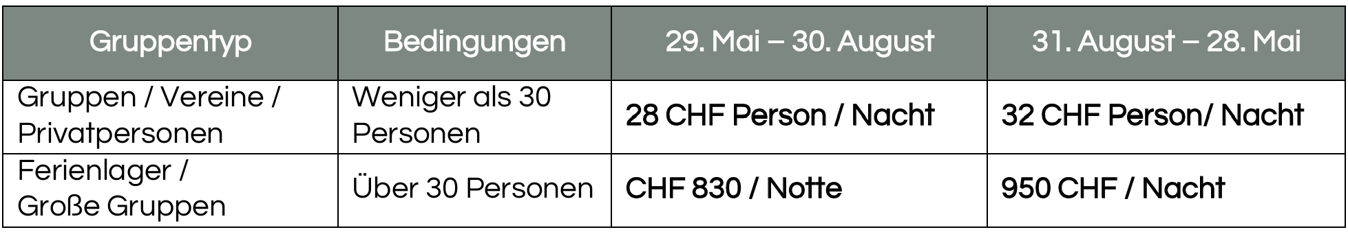 Aufenthalt Ferienlager & Gruppen: CHF 950.00 / Nacht (31. August – 28. Mai)